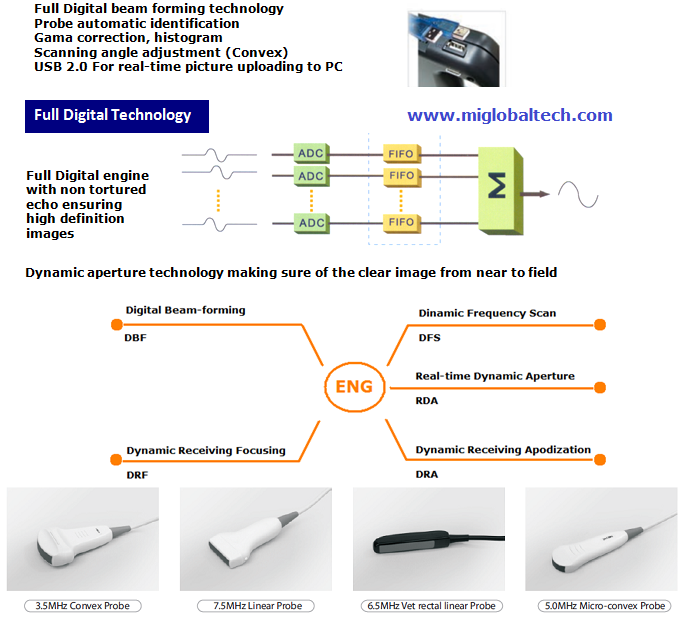 DIGITAL Palm Handheld Ultrasound 3000V /MIG-1830V is the latest model, weighting only 1.3KG,is distinguishable by its bright and clear image quality. The interchangeable probes offer a wide range of diagnostic applications.This scanner is a cost effective solution for veterinary scanning.The complete software and the high product versatility are available in it.